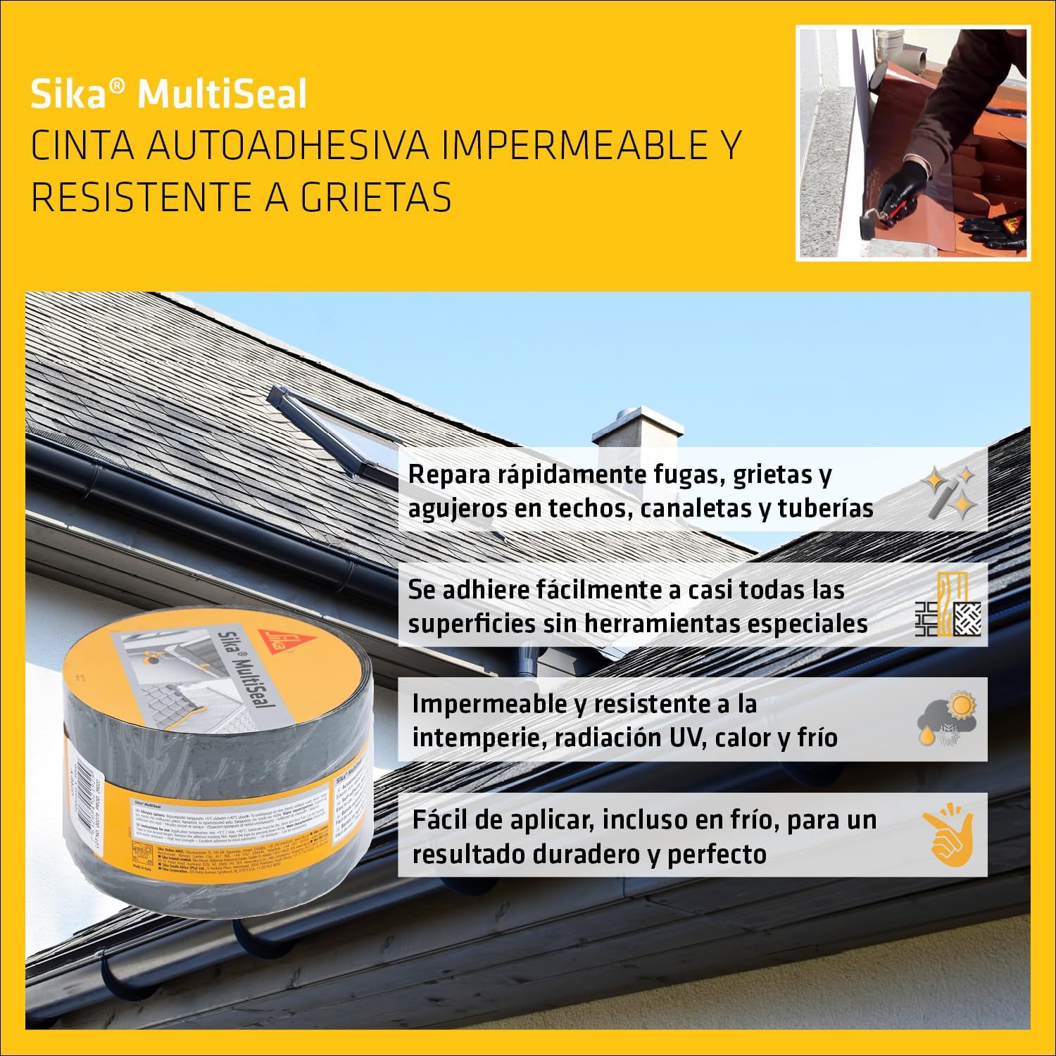 La Banda impermeabilizante SIKA MULTISEAL de Sika es una banda bituminosa autoadhesiva, de betún modificado, provisto en una de sus caras de una hoja de aluminio lacado y en la otra de un film de plástico siliconado retirable.