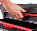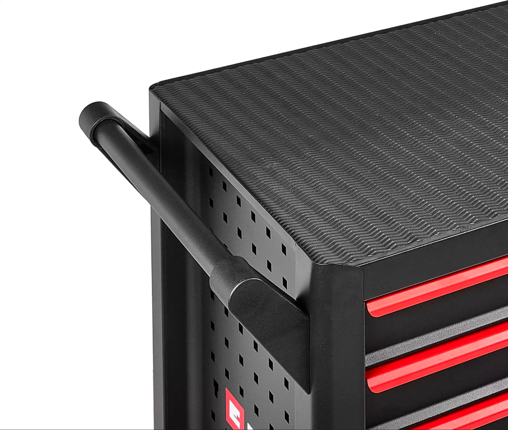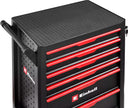 Carro de almacenamiento robusto y móvil, ideal para organizar herramientas y accesorios en talleres domésticos o profesionales. Presentado sin herramientas, ofrece una estructura sólida en color negro con detalles rojos, con seis cajones para máxima versatilidad.