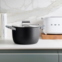 Conjunto de 4 piezas de menaje Smeg ideal para completar la cocina, este conjunto está formado por: Olla de 26 cm con una capacidad de 7,7 l, cacerola de 28 cm con una capacidad de 3,7 l, cazo de 20 cm con una capacidad de 2,7 l, satén de 24 cm con un acabado negro mate antiadherente están diseñados para todo tipo de preparaciones y recetas, son perfecta en función del estilo y calidad de comida que se está cocinando.