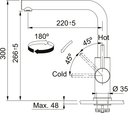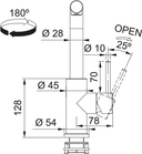 Grifo de cocina Glenda Swivel Inox, altura total de 300 mm, con maneta lateral, aireador laminar y mecanismo cerámico. Este grifo tiene una rotación del cabezal 180º y la apertura de la maneta es de 90º.