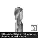• 5 brocas para metal (diámetros de 2, 3, 4, 5 y 6 mm): Fabricadas en acero HSS forjado en caliente con punta dividida de 135°, lo que permite perforaciones precisas sin deslizamientos y aumenta la velocidad de trabajo.