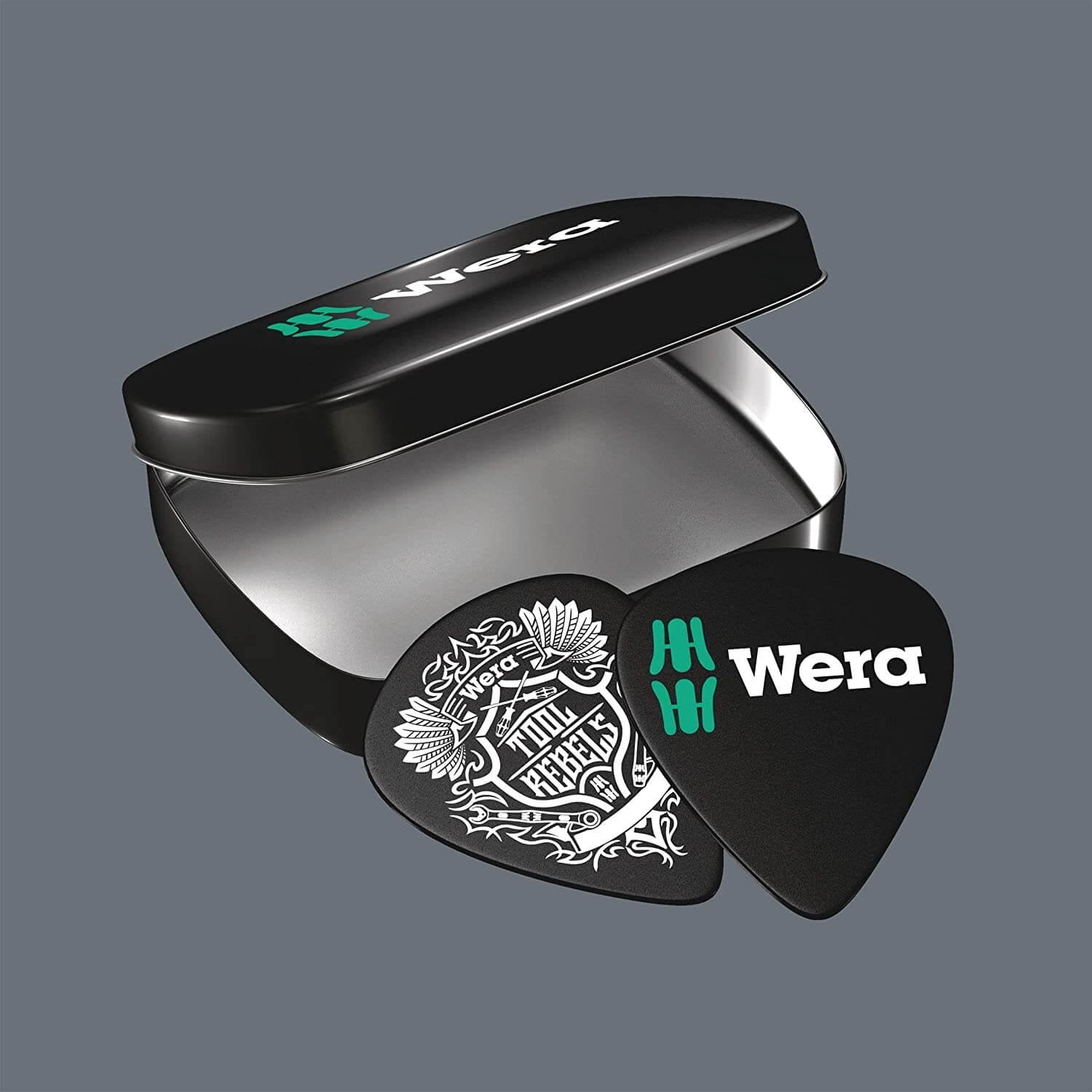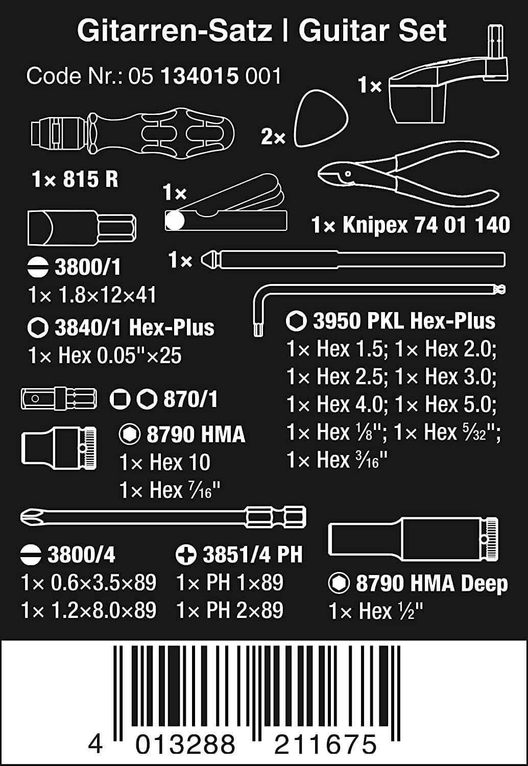 Puntas de acero inoxidable de Wera de un largo de 89 mm para tornillos de hexágono interior (en los tamaños 1,5, 2,0, 2,5), mango tipo Kraftform para puntas de 1/4", puntas de acero inoxidable de 1/4" para tornillos de ranura (de 1,8x12x41 mm, de 0,6x3,5x89 mm, de 1,2x 8,0x89 mm), para tornillos de ranura en cruz (tipos PH de 1x89 mm y PH de 2x89 mm) así como para tornillos de hexágono interior (de 0,05"x25 mm), un adaptador de Wera para el mango (la toma hexagonal del mango de 1/4"- al cuadradillo de 1/4" de los vasos), vasos tipo Wera Zyklop (en los tamaños 10 y 1/2"), manivela para cuerdas con hexágono de 1/4" para conectarla con el mango, tenaza Knipex para el corte de cuerdas, calibre fijo, inputjacker, 2 plectros.