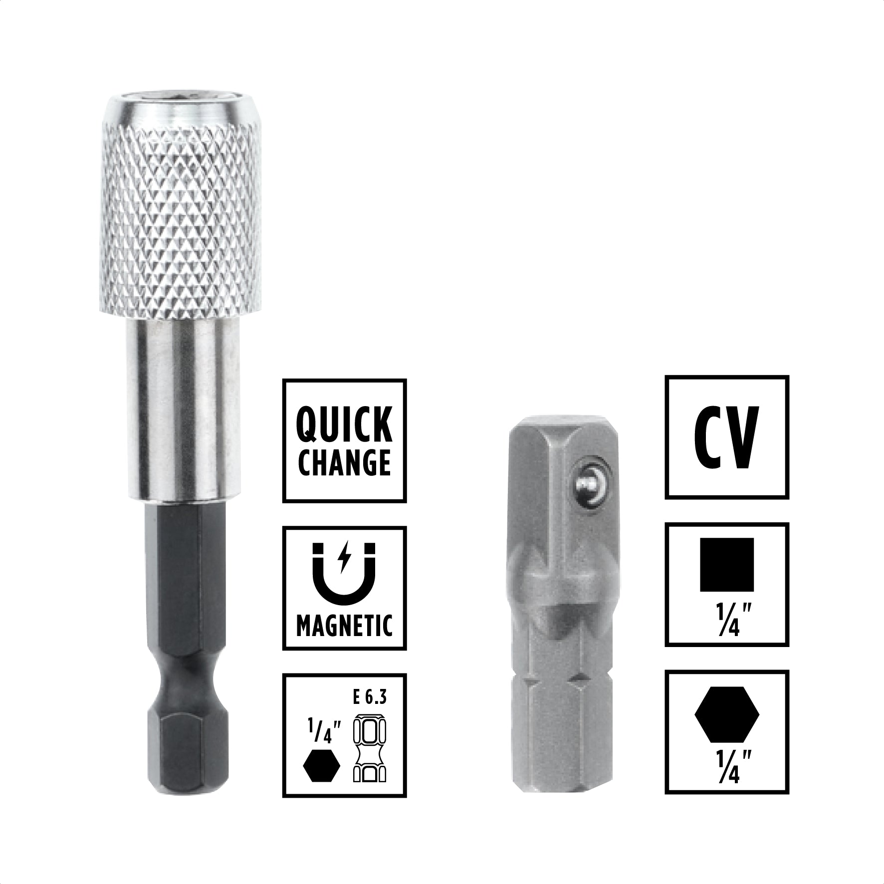 - 1 portapuntas de cambio rápido de 60 mm con vástago E 6.3, fabricado en acero al carbono duradero, que permite cambios de puntas rápidos y sencillos gracias a su potente imán.