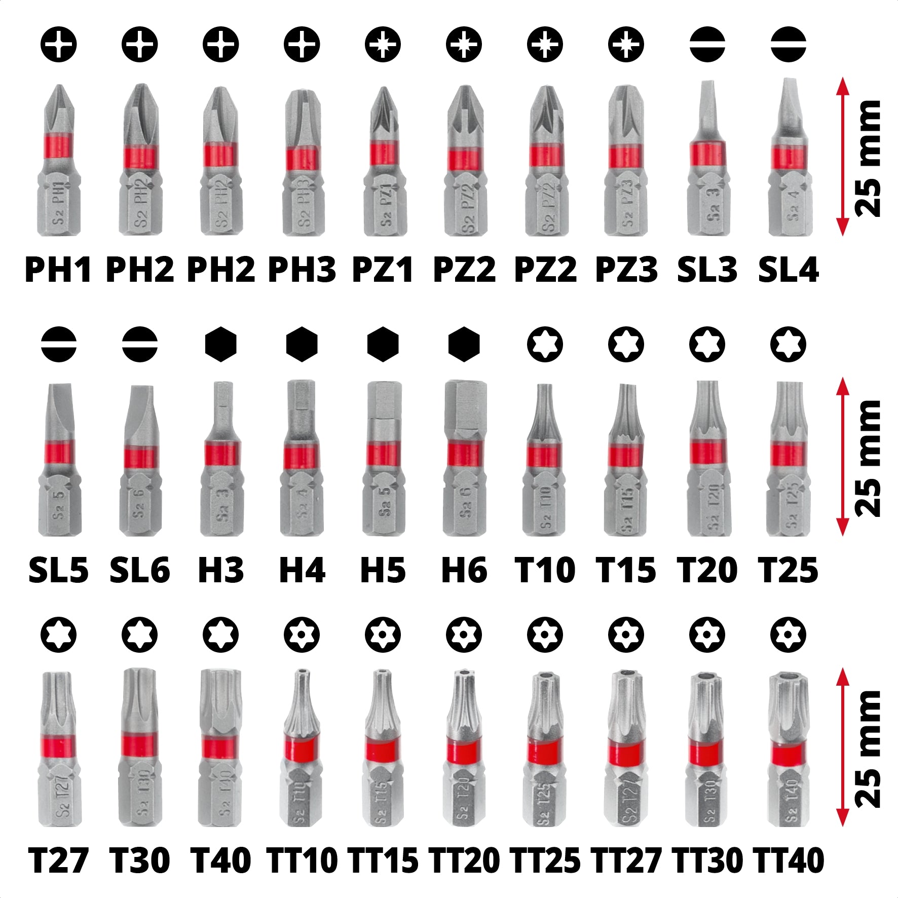 30 puntas de 25 mm con vástago C 6.3, identificadas con un anillo rojo para facilitar su reconocimiento. Las puntas incluidas son: