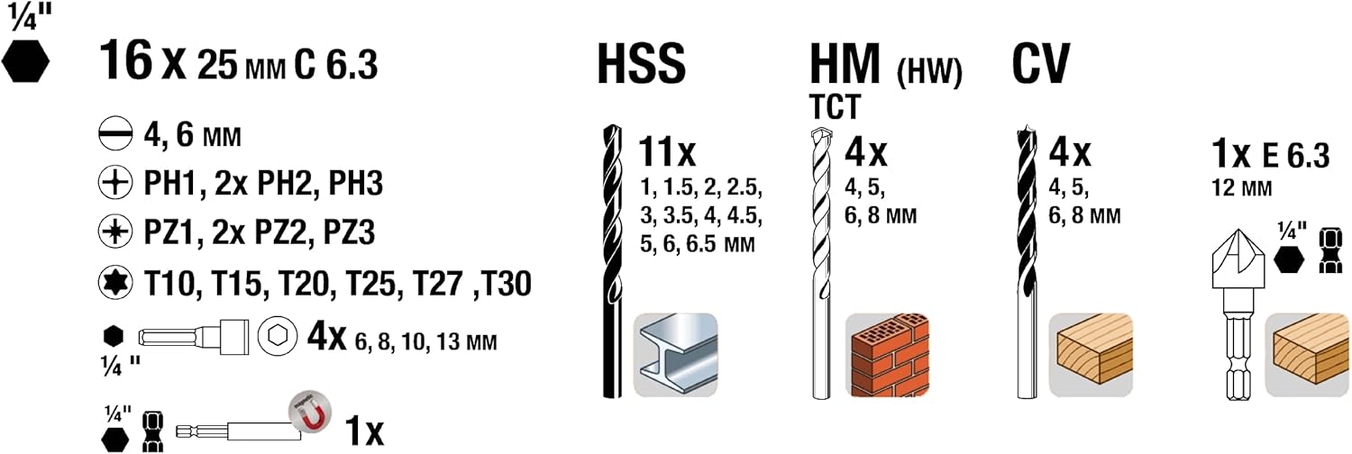 Este conjunto es el complemento perfecto para destornilladores de batería, taladros recargables y taladros con cable, ofreciendo una solución integral para una amplia gama de tareas de perforación y atornillado.