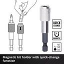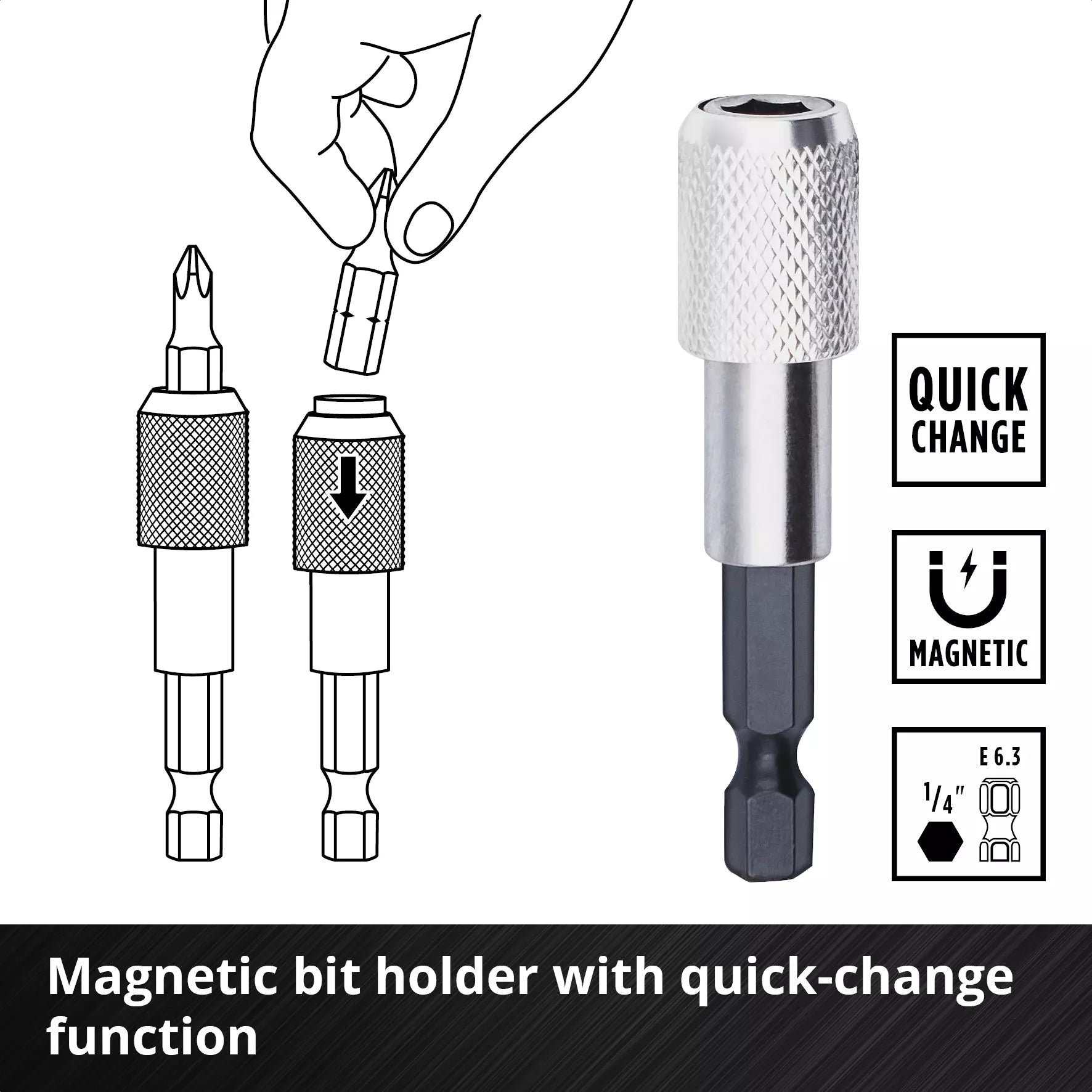 • 1 portapuntas de cambio rápido de 60 mm, fabricado en acero al carbono con vástago E 6.3 y un potente imán para una sujeción firme y cambios rápidos de puntas.