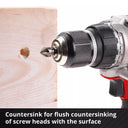 • 1 avellanador de 12 mm con seis filos de corte y vástago E 6.3, ideal para avellanar cabezas de tornillos al ras de la superficie.