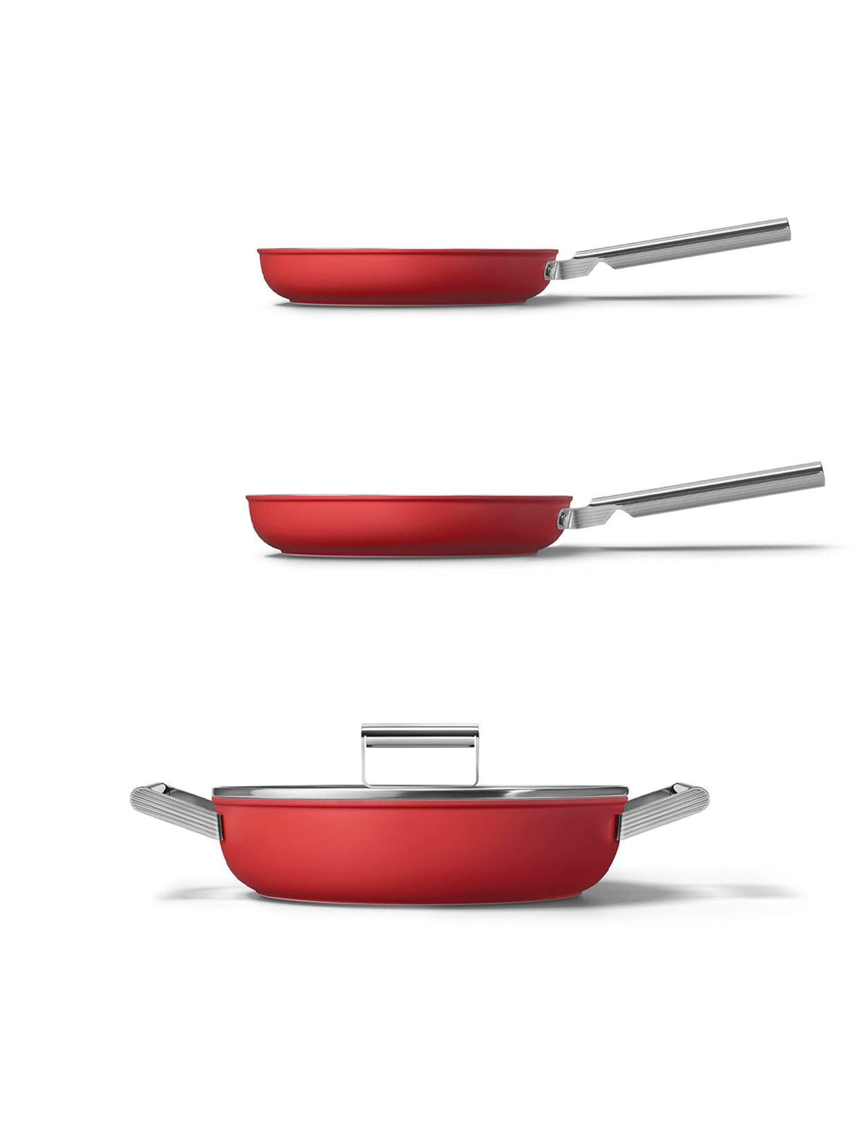 Conjunto de sartenes de menaje Smeg ideal para completar la cocina, este conjunto está formado por: satén de 26 cm y 24 cm, cacerola de 28 cm con una capacidad de 3,7 l con un acabado rojo mate antiadherente están diseñados para todo tipo de preparaciones y recetas, son perfecta en función del estilo y calidad de comida que se está cocinando.