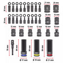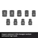 3 vasos de impacto largos de 80 mm de longitud, diseñados para cambios de ruedas en vehículos con llantas de aleación.