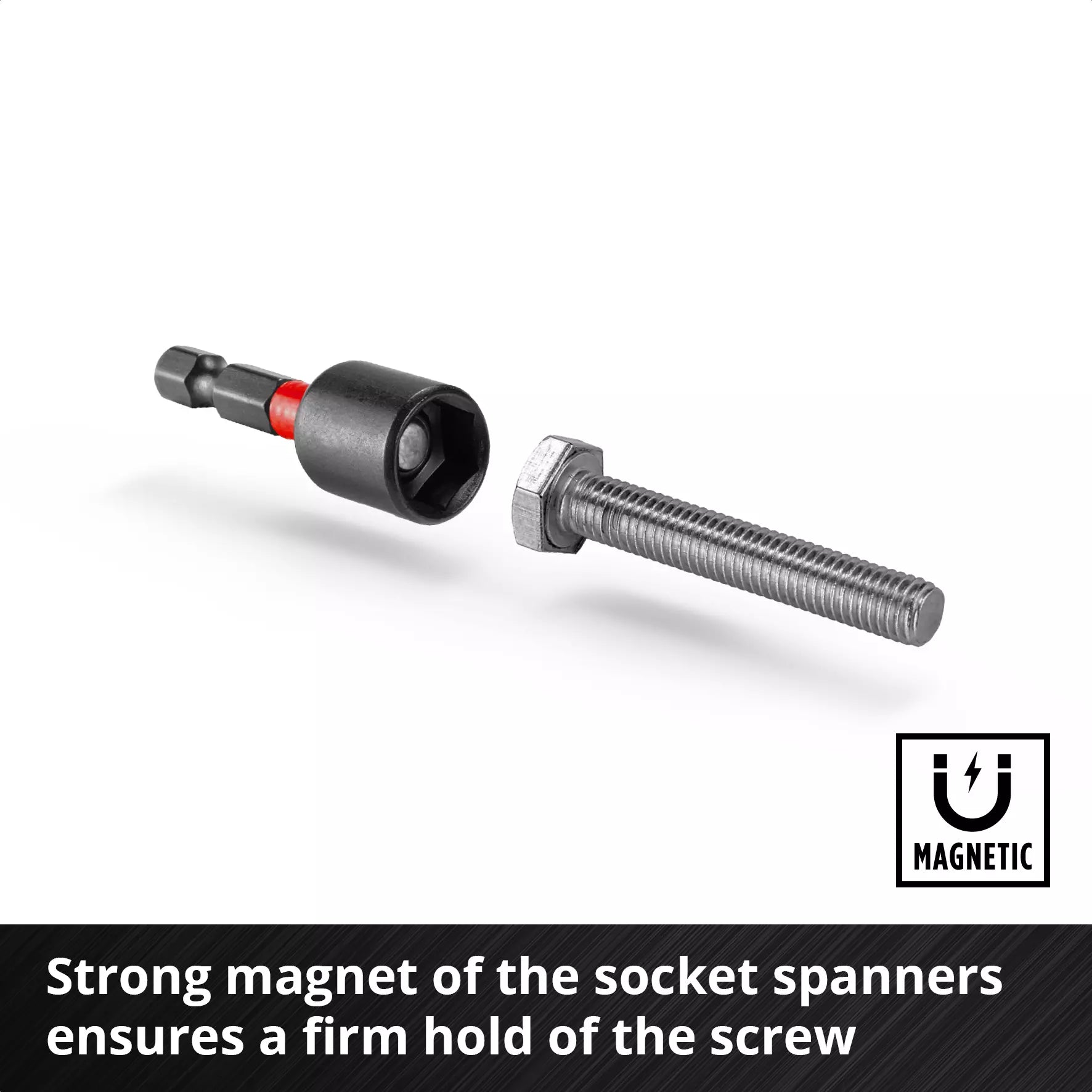 • Materiales de alta calidad: Las puntas están fabricadas en acero S2 robusto y fosfatado con manganeso, mientras que las llaves de vaso están hechas de acero al cromo vanadio (CV) fosfatado con manganeso, garantizando durabilidad y resistencia.