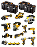 El kit de Dewalt contiene Taladro Percutor DCD796 + Martillo Electroneumático DCH273 + Mini-Amoladora DCG405 + Atornillador de Impacto DCF887 + Llave de Impacto DCF891 + Sierra de Calar DCS331 + Sierra Circular DCS391 + Multi-Herramienta DCS356 + Cepillo DCP580 + Mini-Sierra Sable DCS369 + Linterna LED DCL050 + 3bat 5Ah DCB184 + Cargador DCB1104 + 4xTSTAK.