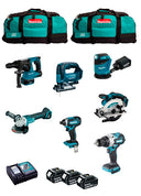Kit Makita que ofrece 7 máquinas DHP486 + DHR243 + DGA504 + DTD152 + DJV182 + DSS610 + DBO180