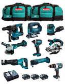 Este kit Makita contiene DHP486 + DHR243 + DGA504 + DTD152 + DJV182 + DSS610 + DBO180 + DJR186 + DTM51 + 3xBL1850B + DC18RC + 2xLXT600