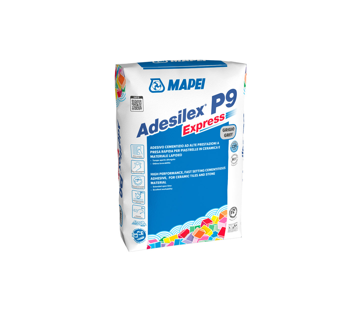 Adesilex P9 Express de la marca Mapei es un adhesivo cementoso de altas prestaciones, con GRIS: deslizamiento vertical nulo y de fraguado rápido, para 6020 baldosas de cerámica y gres porcelánico (espesor aplicable de adhesivo hasta 15 mm).