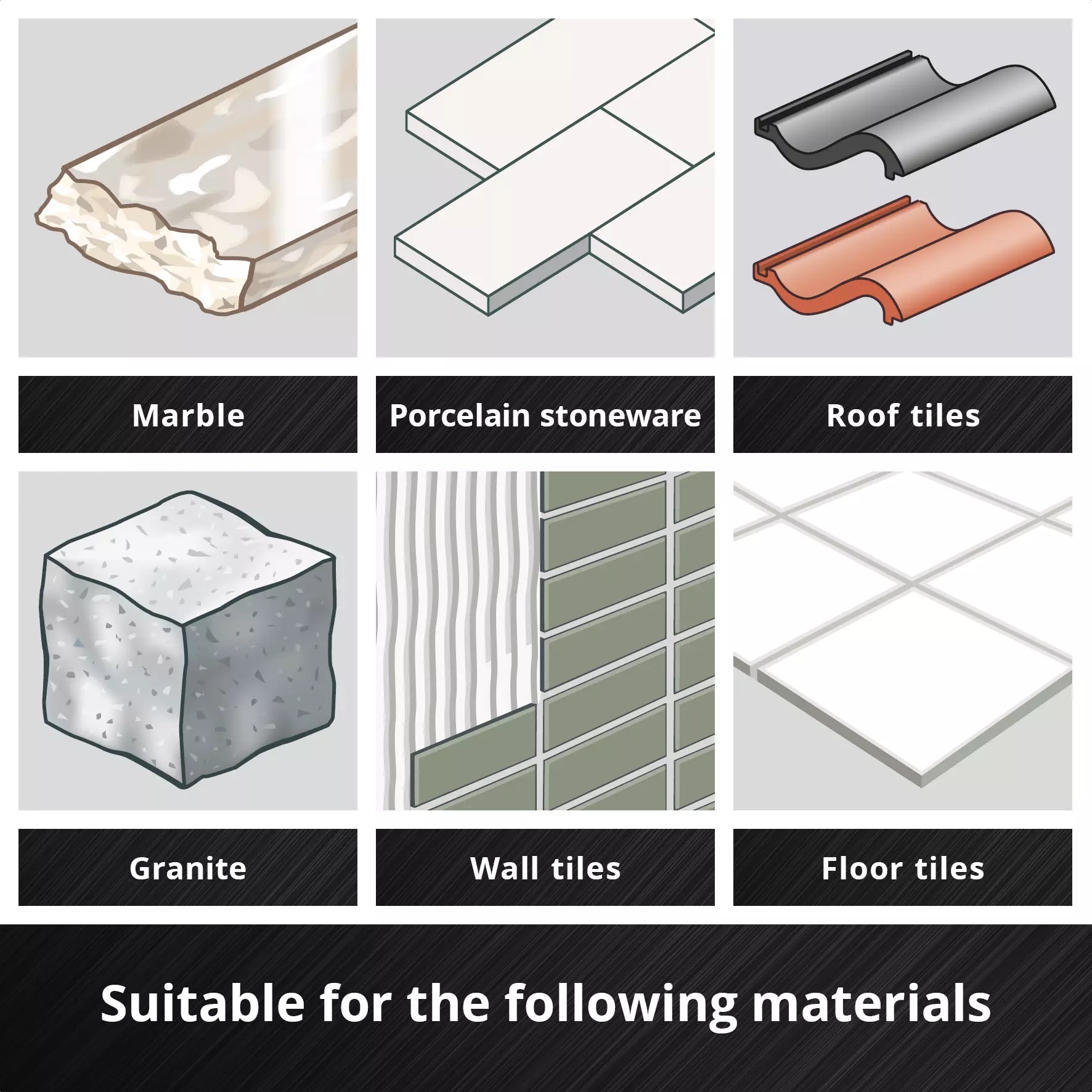 - Diseñadas para perforar materiales como gres porcelánico, mármol, granito, tejas y baldosas de pared y suelo.