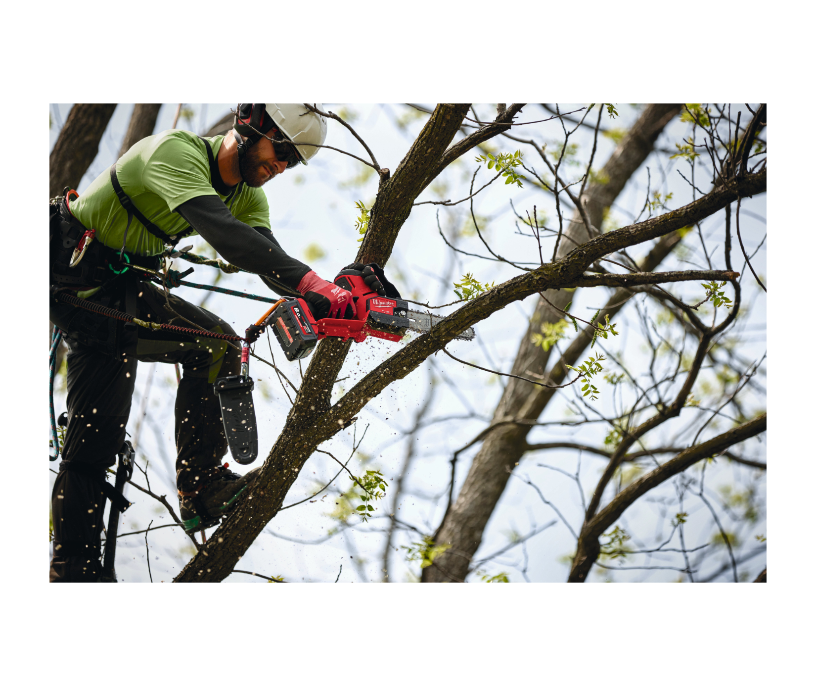 La sierra de poda M18 FUEL HATCHET con barra de 20 cm proporciona una potencia y un par motor excepcionales para cortar maderas duras sin parar.
