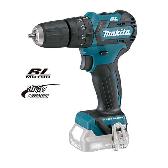 HP332DZ Taladro percutor Makita a batería 10,8V Litio 2Ah con motor sin escobillas BL. Percutor, taladro y atornillador. 18 posiciones de par y taladro. Velocidad variable de 0 a 1.500 rpm. Portabrocas automatico sin llave.