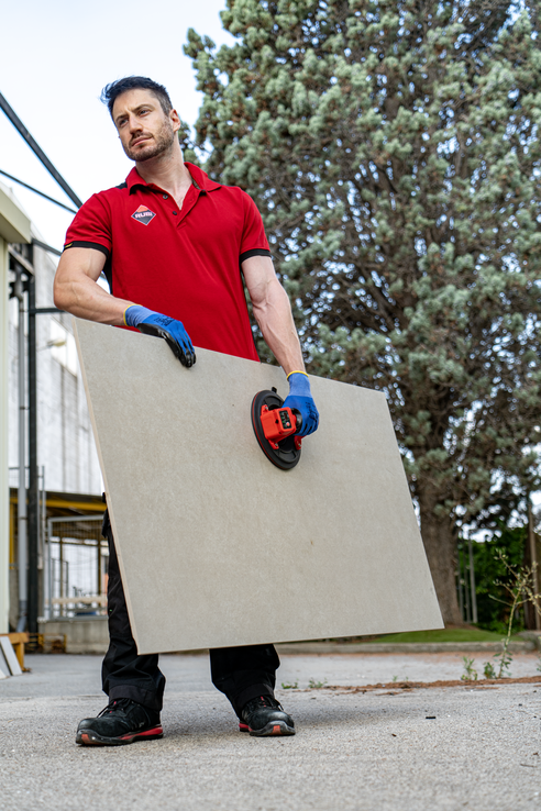 Ventosa a batería diseñada para la manipulación de baldosas cerámicas. Batería de 3.7V / 2 Ah integrada en la ventosa y carga a través de cable USB-C.